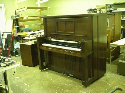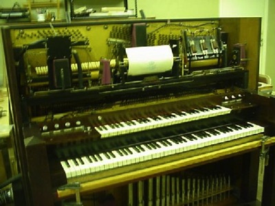 Under the piano keyboard is a good view of the swell shutters for the organ. The finished box at the bass end contains a suction unit for the player and a pump for the pipe organ.
