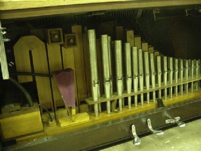 Originally, there was an octave of diapason pipes on a chest attached to the rear frame of the piano, but unfortunately these were discarded years ago.