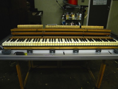 Old hammer shank assemblies off, new hammers bored and ready to hang.