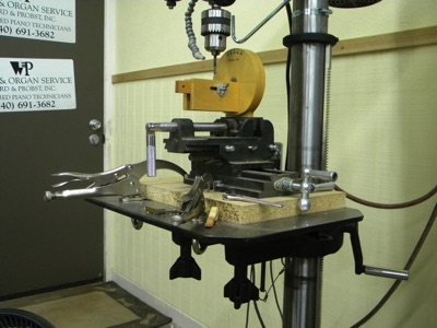The action in the Grandworks™ regulation station in preparation for installing new shanks and hammers. See TPR Tools in our Links section for more information.