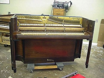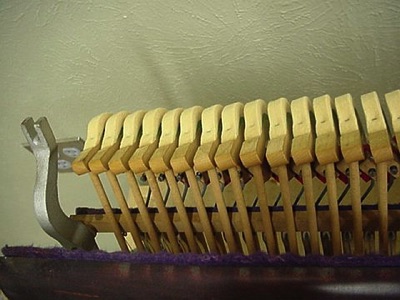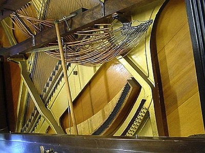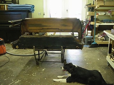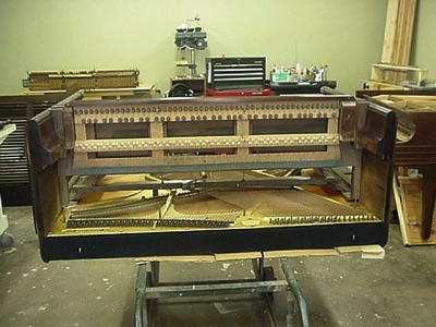 Bottom board is removed to gain access to the bass string hitch panel prior to removing the bass strings.