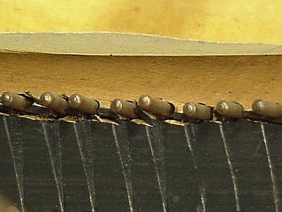The bass strings are unhitched and moved to the side for bass bridge repair.